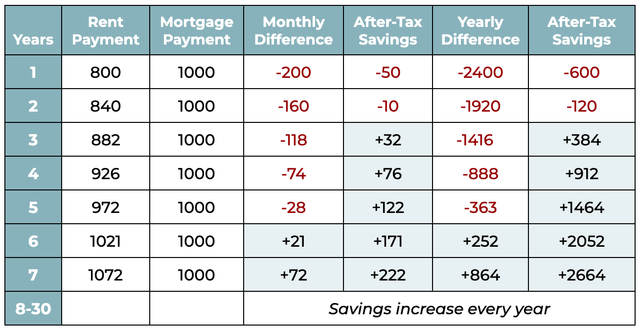 The chart above shows a cost comparison for a renter and a homeowner over a seven-year period. The renter starts out paying $800 per month with annual increases of 5%. The homeowner purchases a home for $110,000 and pays a monthly mortgage of $1,000. After six years, the homeowner’s payment is lower than the renter’s monthly payment. With the tax savings of homeownership, the homeowner’s payment is less than the rental payment after three years.