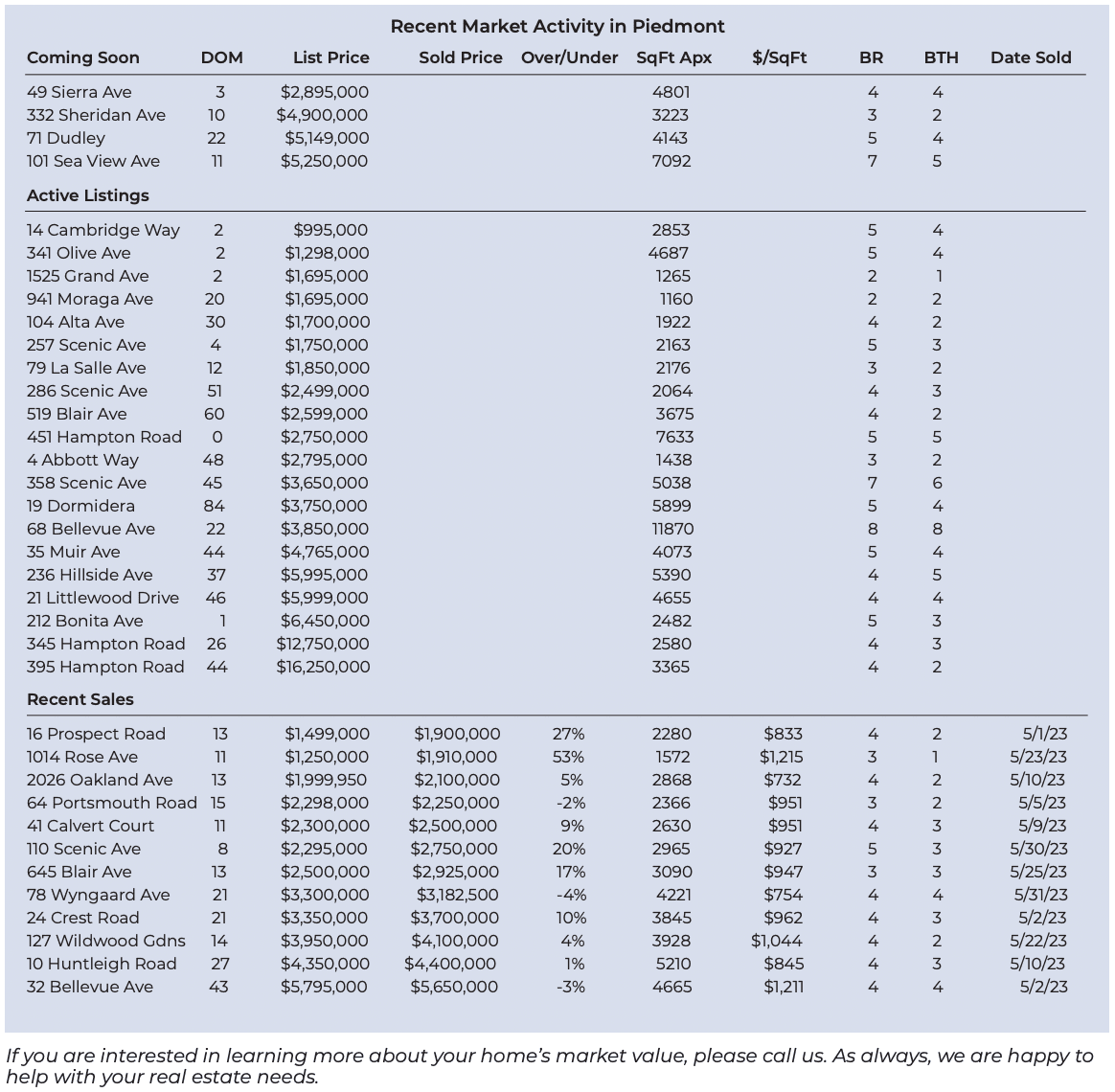 Looking at the recent Piedmont sales on the back page of this newsletter, we found that homes appear to be staying on the market longer. Properties sold in May were on the market for an average of 18 days. However, currently pending properties were on the market for an average of 32 days. Active properties on the market have already been on the market more than 29 days. This may point to a slowing market.