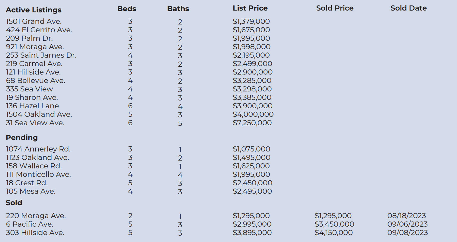 In Piedmont, when we look at sales data going back five years to January 2019, we see a steady upward appreciation trend until 2023. We do not yet have a full set of data for the current year; however, to date, homes in Piedmont appear to be selling on average for 10% less than they did at their average high sales price in 2022. Even with this, in Piedmont, we have seen an average annual appreciation of approximately 5% since 2019.
