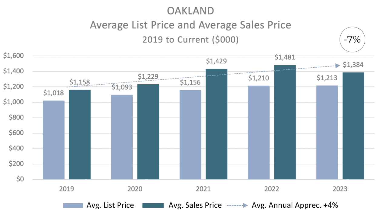 In Oakland, we also see a steady upward appreciation trend until 2023. Like with Piedmont, we do not yet have a full set of data for this year; however, to date, homes in Oakland appear to be selling, on average, for 7% percent less in 2023 than they did at their average high sales price in 2022. Even with this, we have seen an average annual appreciation of approximately 4% in Oakland since 2019.